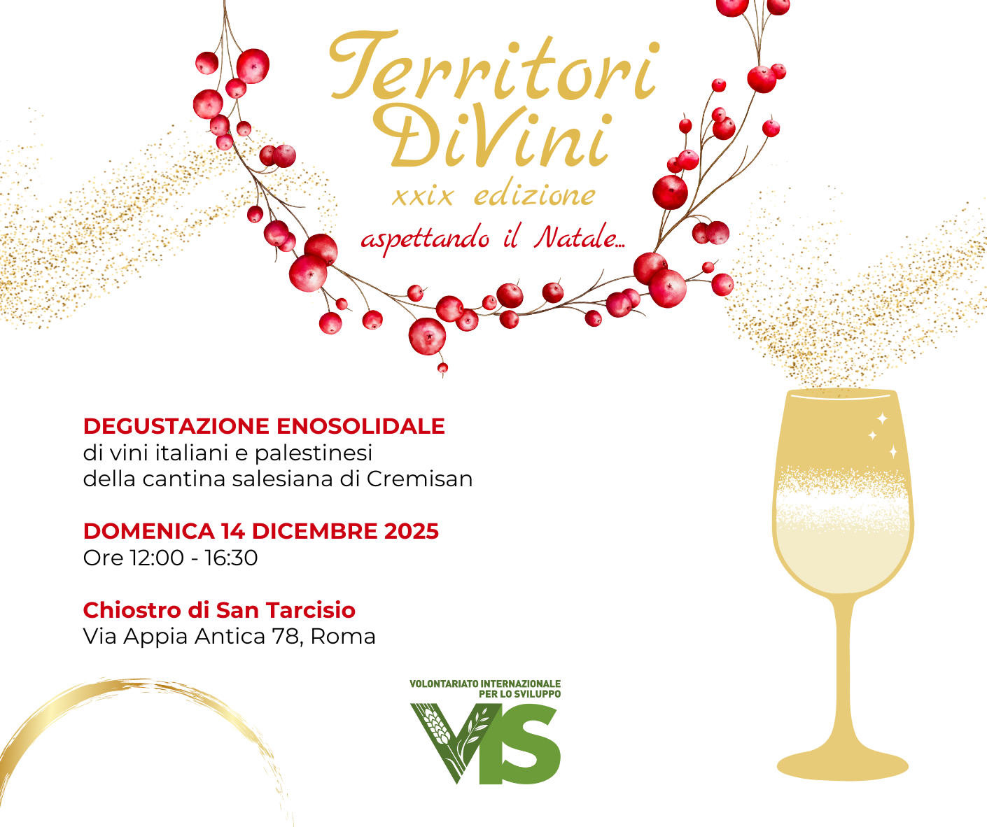 Domenica 14 dicembre torna il tradizionale appuntamento per gli amici del VIS appassionati di vino e solidarietà: “Territori DiVini", la nostra degustazione enosolidale giunta alla 29esima edizione. Ci ritroveremo dalle 12 alle 16:30 presso lo splendido Chiostro di San Tarcisio all’interno dello Parco delle Catacombe di San Callisto a Roma.